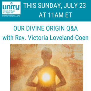This month we've been exploring our Divine origins. And because we know that what we believe about ourselves is reflected in every area of our lives, it behooves us to embrace a Divinely inspired vision. Last week we practiced repeating a powerful mantra used by Ram Dass: "I am loving awareness" and were invited to incorporate that into our daily practice, and to pay attention to the resistance that might have come up around living into this higher awareness. This Sunday you will have an opportunity to share the thoughts that have been bubbling up for you this month, and/or ask questions on any aspect of spiritual growth. Let's get a conversation going!